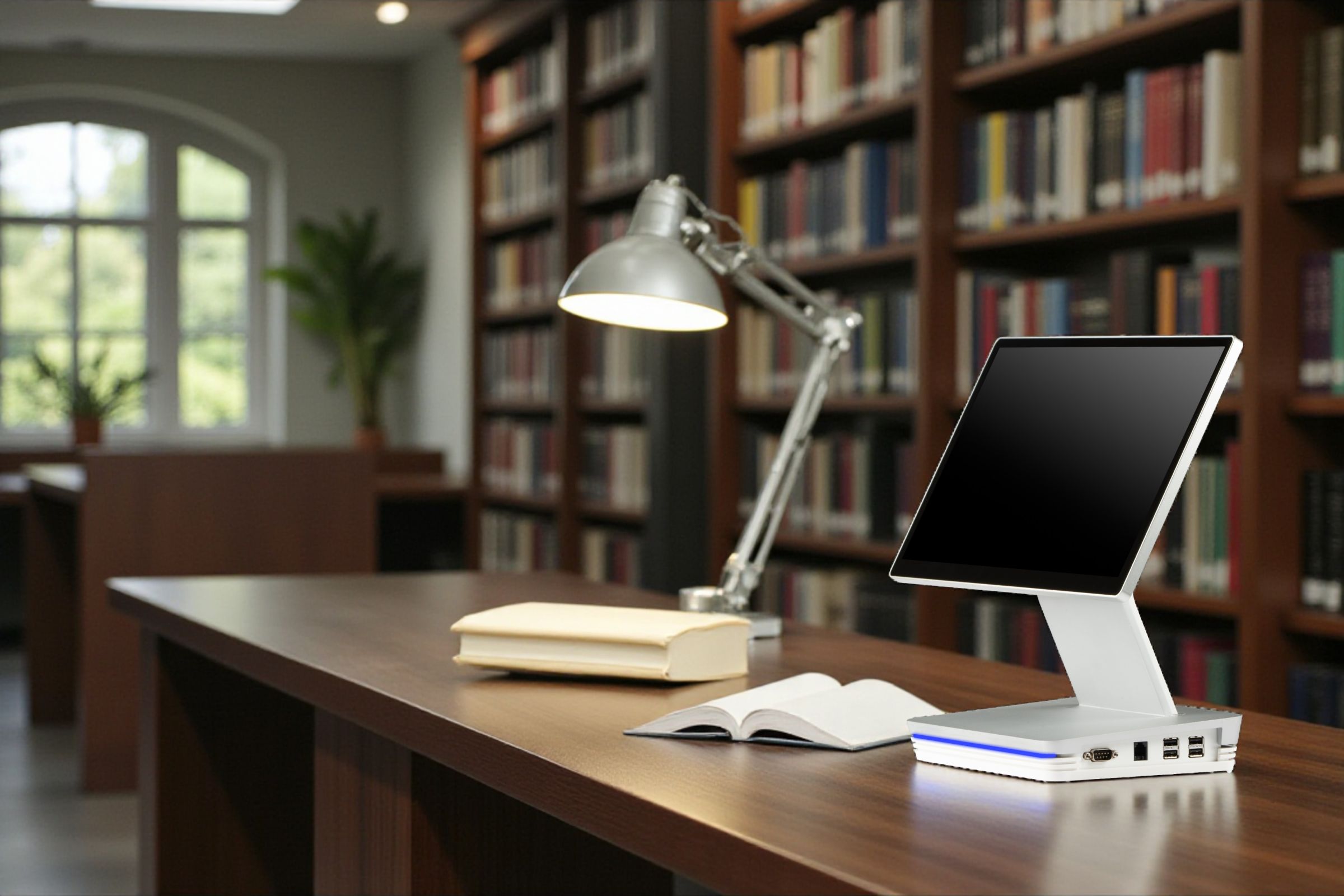 Egy elegáns POS terminál beállítva egy könyvtári pultra, amely támogatja a könyvkölcsönzést, érdeklődéseket és a látogatók kezelését.